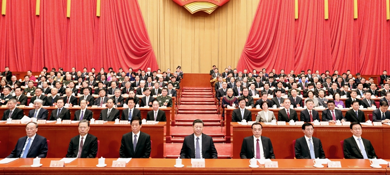 Xi Jinping (C, front), Li Keqiang (3rd R, front), Li Zhanshu (3rd L, front), Wang Huning (2nd R, front), Zhao Leji (2nd L, front), Han Zheng (1st R, front) and Wang Qishan (1st L, front) attend the closing meeting of the second session of the 13th National Committee of the Chinese People's Political Consultative Conference (CPPCC) at the Great Hall of the People in Beijing, capital of China, March 13, 2019. (Xinhua/Huang Jingwen)