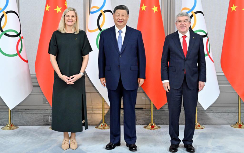 In a joint moment, the final torchbearers, Guangdong sprinter Su Bingtian, Asia's 100m record holder, Hong Kong Olympic fencing champion Cheung Ka Long, and Macao's Li Yi, Asian Games wushu gold medalist, lit the main cauldron.