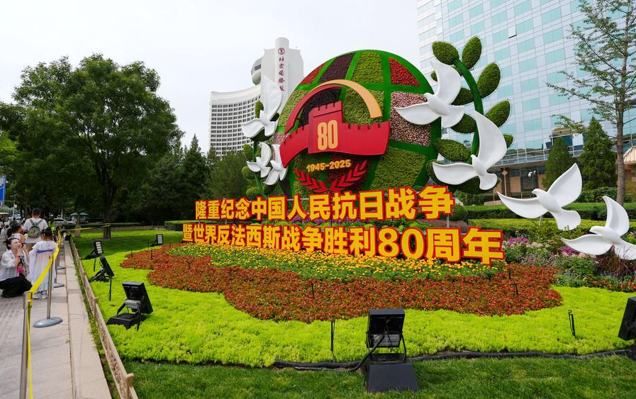 A set of floral installation is pictured at Jianguomen in Beijing, capital of China, Aug. 26, 2025. Ten sets of floral installations along Chang'an Avenue marking the 80th anniversary of the victory in the Chinese People's War of Resistance Against Japanese Aggression and the World Anti-Fascist War have been completed. (Xinhua/Ju Huanzong)