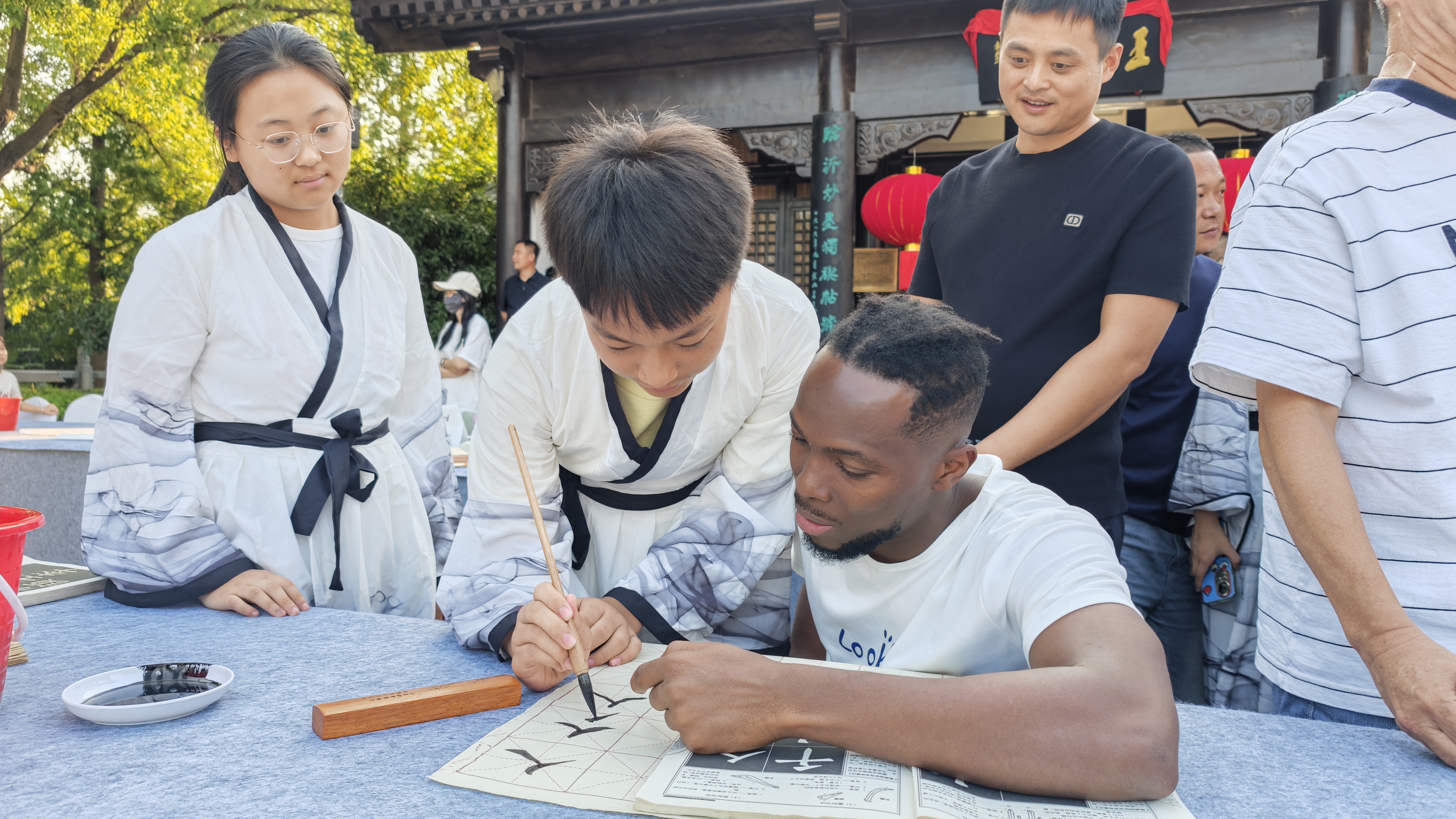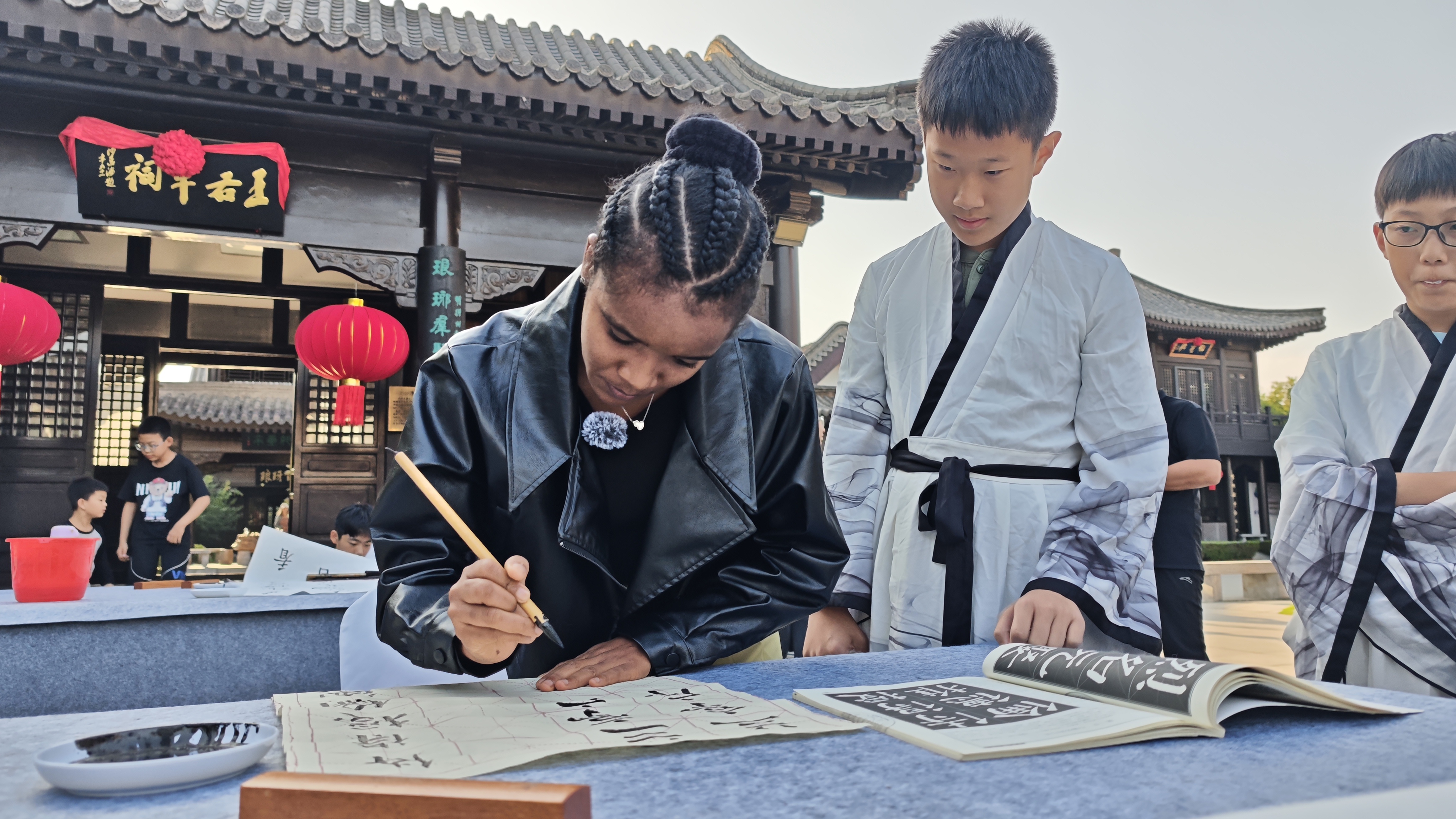 International students from Linyi University engaged in an immersive cultural experience of calligraphy at Former Residence of Wang Xizhi, Linyi City, east China's Shandong Province, Sep 20.