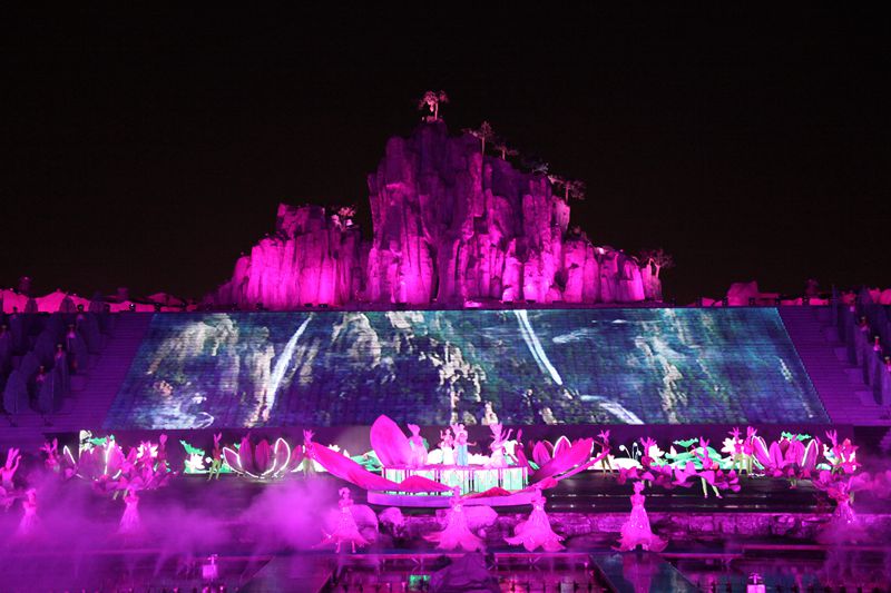 Mengshan Yishui adopts field performances and its main stage is built on the Huxin Island in Yihe River. With the main stage and the minor stage before the water covering more than 8,000 square meters, they can accommodate almost 2,000 spectators.