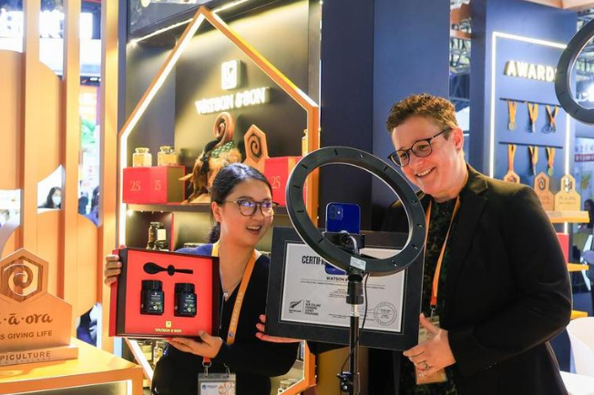 Exhibitors conduct a live streaming event at the booth of a New Zealand honey brand at the Food and Agricultural Products exhibition area during the eighth China International Import Expo (CIIE) in East China's Shanghai, on Nov 6, 2025. [Photo/Xinhua]