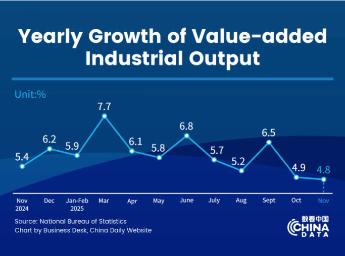 The value-added industrial output, a key economic indicator, increased 4.8 percent year-on-year in November, the NBS said.
