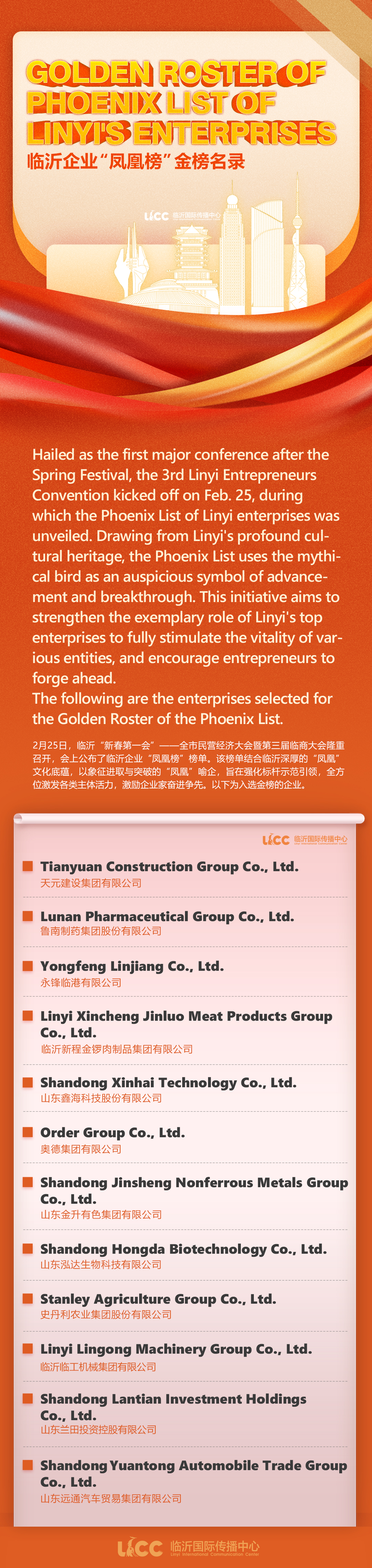 LINYI, Feb. 25 -- Hailed as the first major conference after the Spring Festival, the 3rd Linyi Entrepreneurs Convention kicked off on Feb. 25, during which the Phoenix List of Linyi enterprises was unveiled. Drawing from Linyi's profound cultural heritage, the Phoenix List uses the mythical bird as an auspicious symbol of advancement and breakthrough. This initiative aims to strengthen the exemplary role of Linyi's top enterprises to fully stimulate the vitality of various entities, and encourage entrepreneurs to forge ahead.