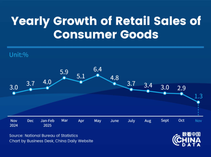 China's retail sales of consumer goods went up 4 percent year-on-year in the first 11 months of 2025, totaling 45.61 trillion yuan ($6.45 trillion) during the period, the National Bureau of Statistics said on Monday.