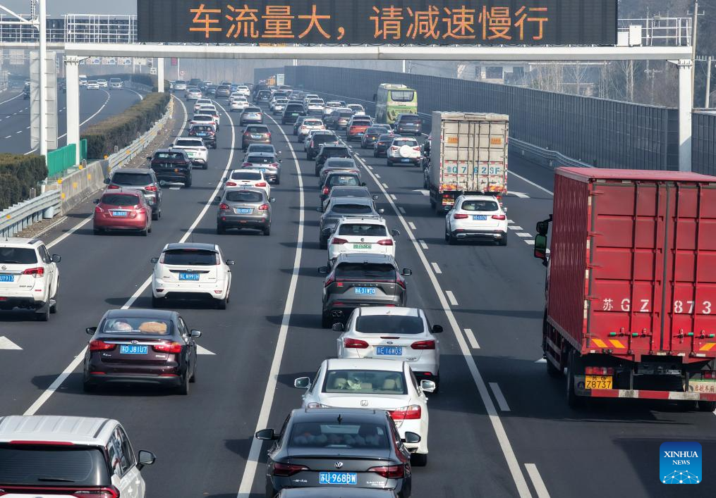 A drone photo taken on Feb. 15, 2026 shows vehicles driving on an expressway in Yangzhou, east China's Jiangsu Province. Over 285 million inter-regional passenger trips are predicted across China on Sunday, the first day of this year's nine-day Spring Festival holiday. The figure represents a 10.5 percent increase from the same period last year, the Ministry of Transport said on Sunday. (Photo by Meng Delong/Xinhua)