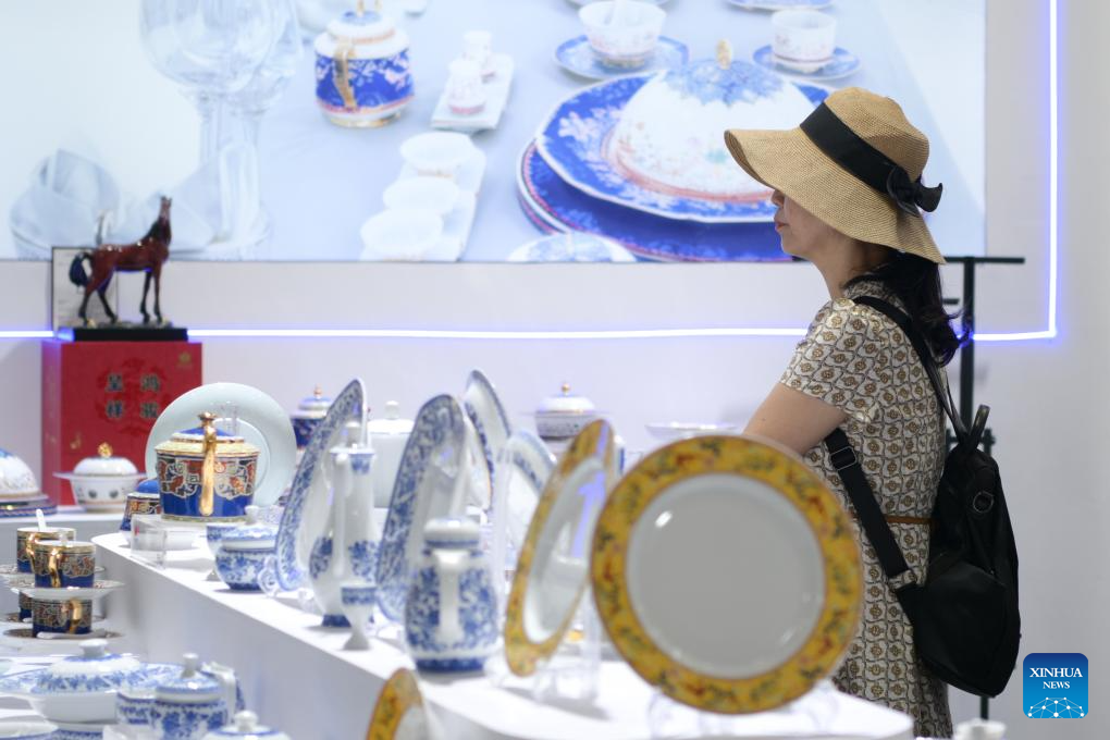 A woman looks at ceramic products from Jingdezhen, known as China's "porcelain capital," during the sixth China International Consumer Products Expo (CICPE) in Haikou, south China's Hainan Province, April 15, 2026. From intangible cultural heritage skills to original IPs with traditional Chinese cultural characteristics, Chinese brands blend tradition with modernity and showcase their charm at the ongoing CICPE, attracting the attention of many visitors. (Xinhua/Xin Yuewei)