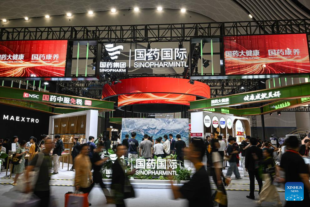 This photo taken on April 15, 2026 shows the booth of Sinopharm International at the sixth China International Consumer Products Expo (CICPE) in Haikou, south China's Hainan Province. From intangible cultural heritage skills to original IPs with traditional Chinese cultural characteristics, Chinese brands blend tradition with modernity and showcase their charm at the ongoing CICPE, catching eyes of many visitors. (Xinhua/Pu Xiaoxu)