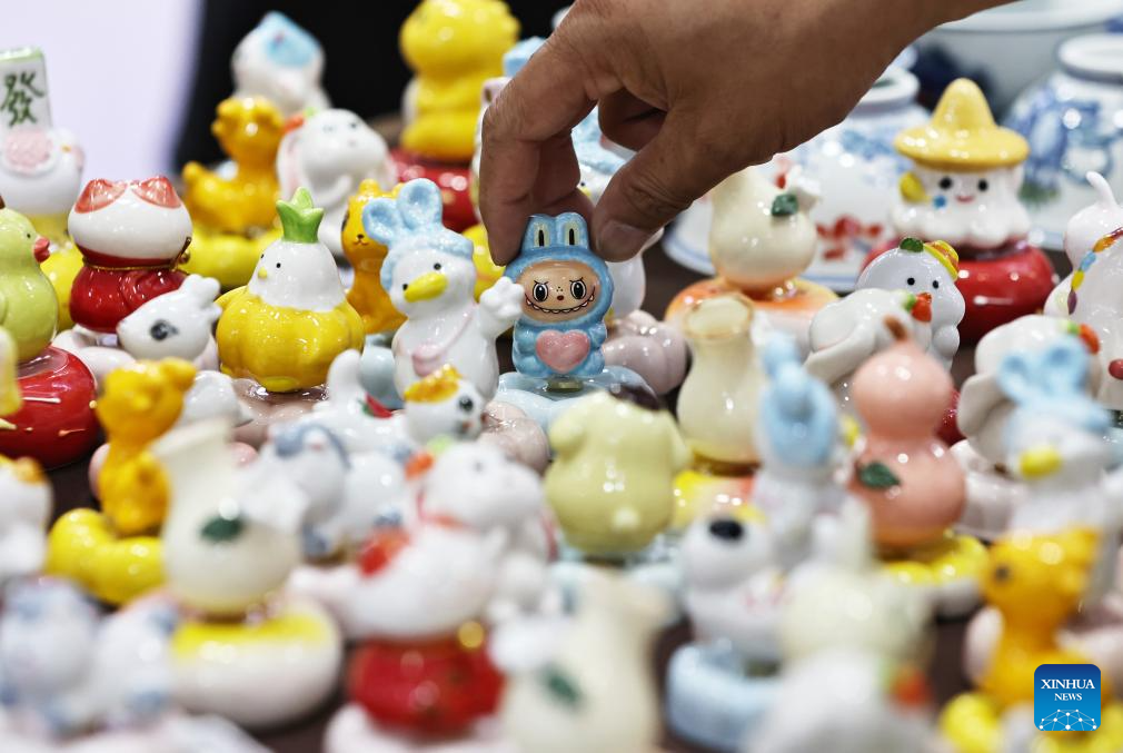 Creative ceramic products are pictured at the sixth China International Consumer Products Expo (CICPE) in Haikou, south China's Hainan Province, April 15, 2026. From intangible cultural heritage skills to original IPs with traditional Chinese cultural characteristics, Chinese brands blend tradition with modernity and showcase their charm at the ongoing CICPE, catching eyes of many visitors. (Xinhua/Gao Jing)