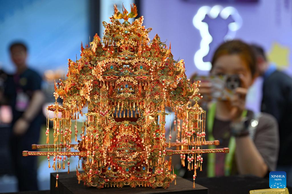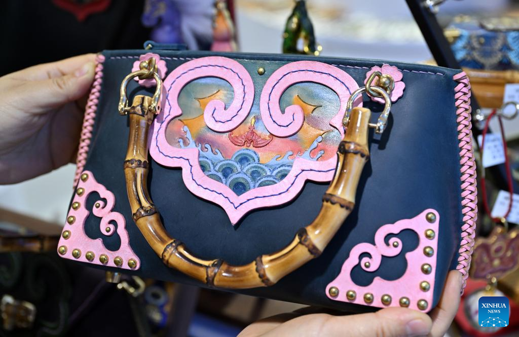 This photo taken on April 15, 2026 shows a handbag made with carved leather, whose craftsmanship is inscribed as an intangible cultural heritage, at the sixth China International Consumer Products Expo (CICPE) in Haikou, south China's Hainan Province. From intangible cultural heritage skills to original IPs with traditional Chinese cultural characteristics, Chinese brands blend tradition with modernity and showcase their charm at the ongoing CICPE, catching eyes of many visitors. (Xinhua/Guo Cheng)