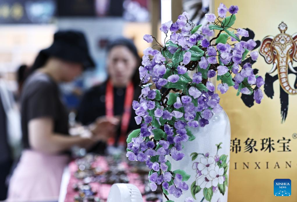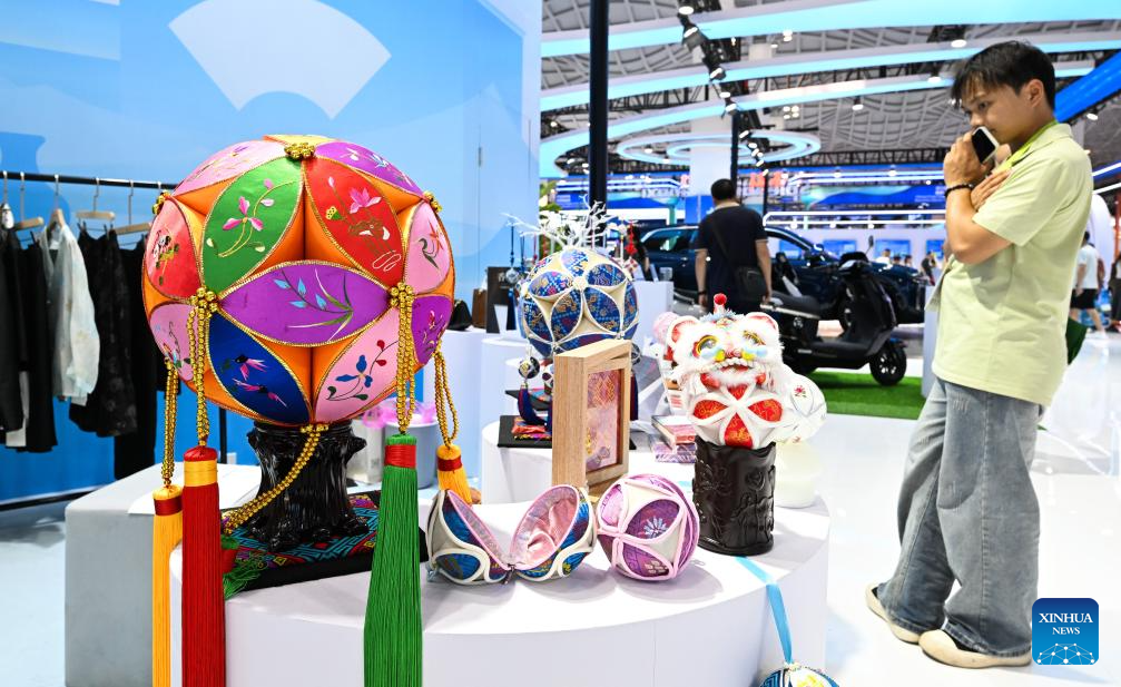 Products themed on embroidered balls are pictured at the sixth China International Consumer Products Expo (CICPE) in Haikou, south China's Hainan Province, April 15, 2026. From intangible cultural heritage skills to original IPs with traditional Chinese cultural characteristics, Chinese brands blend tradition with modernity and showcase their charm at the ongoing CICPE, catching eyes of many visitors. (Xinhua/Yang Guanyu)