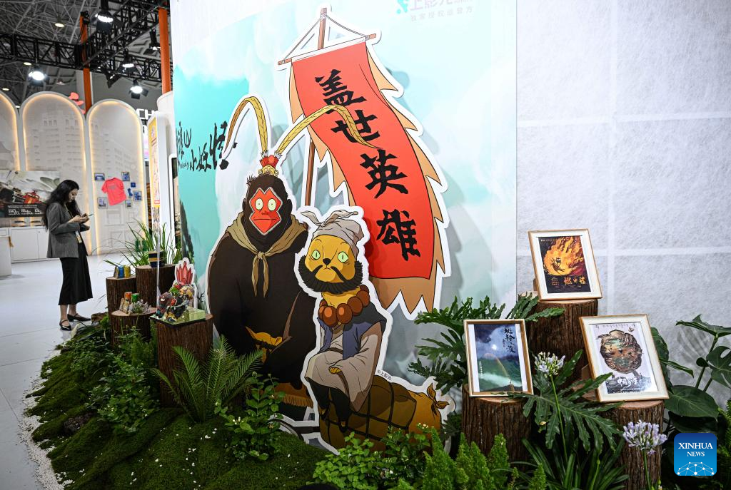 Cultural and creative products themed on Chinese animations are pictured at the sixth China International Consumer Products Expo (CICPE) in Haikou, south China's Hainan Province, April 15, 2026. From intangible cultural heritage skills to original IPs with traditional Chinese cultural characteristics, Chinese brands blend tradition with modernity and showcase their charm at the ongoing CICPE, catching eyes of many visitors. (Xinhua/Pu Xiaoxu)